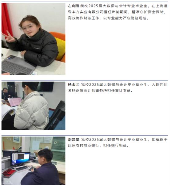 本专业毕业生的职业发展路径广阔,可投身于会计师事务所、税务师事务所、银行、证券、保险等金融机构以及各类工商企业中,担任会计、审计助理、税务专员、财务数据分析师、财务管理、内控咨询、风险管理等多元化核心岗位,具备胜任多领域、多层次财经相关工作的专业能力。