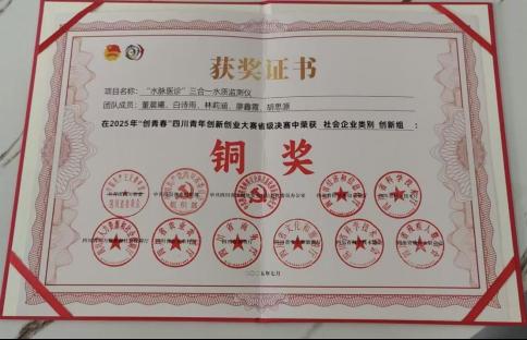 参赛项目“水脉医诊——三合一水质监测仪”高效微生物膜生物降解系统在2025年“创青春”四川青年创新创业大赛优秀项目提升计划暨省级决赛获得社会企业类铜奖