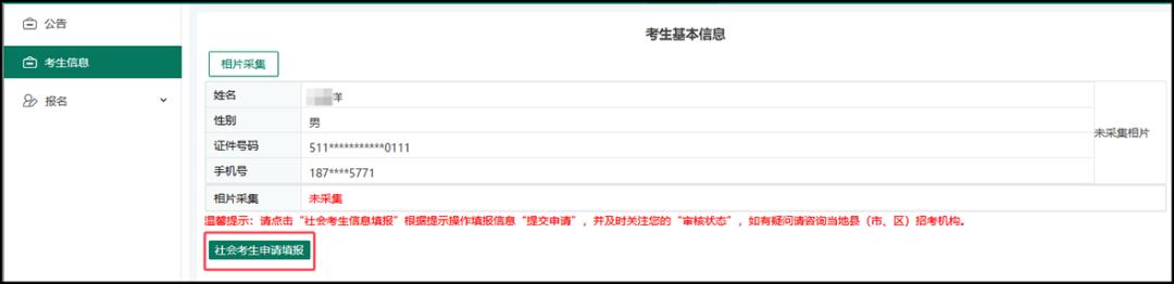社会考生,应先进行报名资格申报,审核通过才能进入报名信息填报,点击“考生信息”菜单,在页面上点击“社会考生申请填报”。