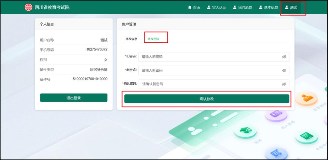 输入证件号码、手机号码、短信验证码、输入2次一致的新密码,点击“确认修改”按钮。