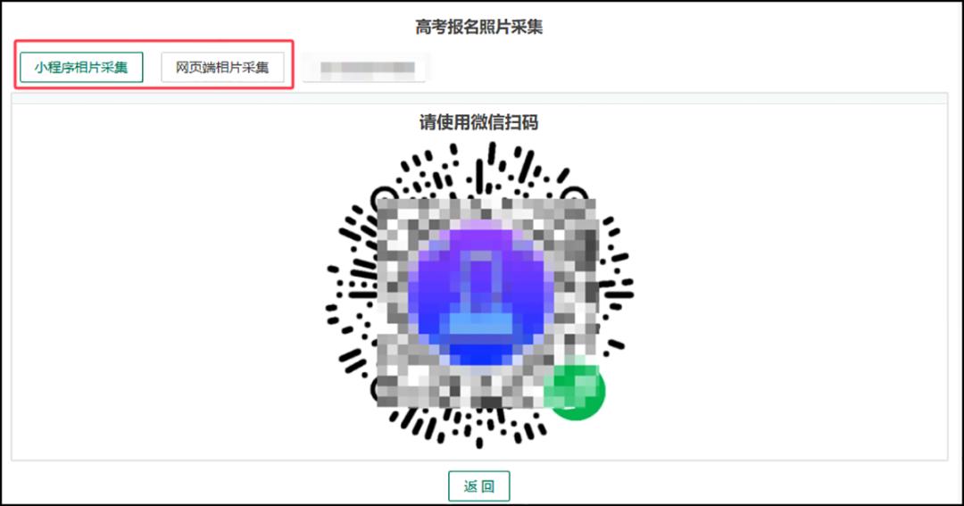 在考生报名信息浏览界面,点“采集相片”,考生可选择:“网页端相片采集”或“小程序相片采集”,并按指引进行线上相片采集。推荐使用微信小程序相片采集功能。