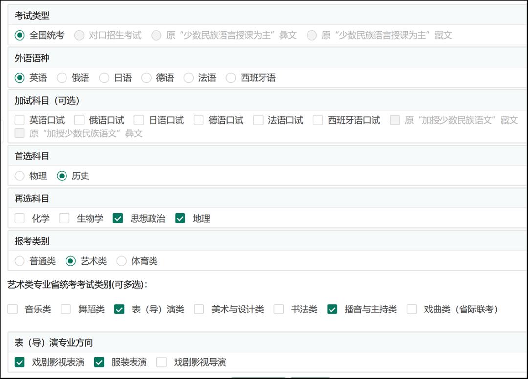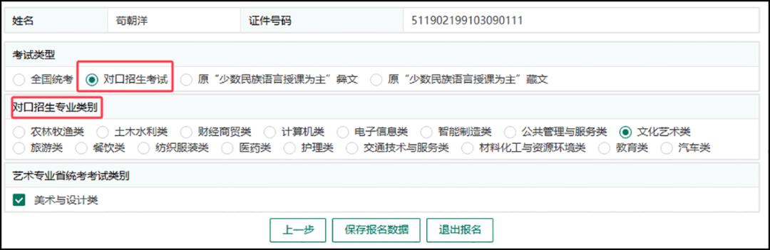 (2)报考对口招生考试的考生,需选择对口招生考试专业类别,选择“文化艺术类”的考生还需选择“艺术专业省统考考试类别”。