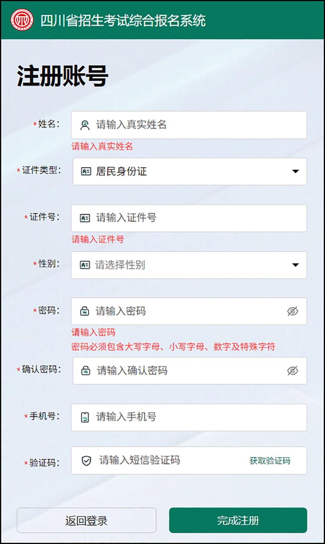 输入四川省招生考试综合报名系统网址https://zhbm.sceea.cn,先点击页面右上角“登录/注册”菜单,再点击“考生账号注册”按钮,进入注册界面。所有考生都需进行实名注册,注册时填写真实姓名、证件号、证件类型、密码、性别、手机号码信息。