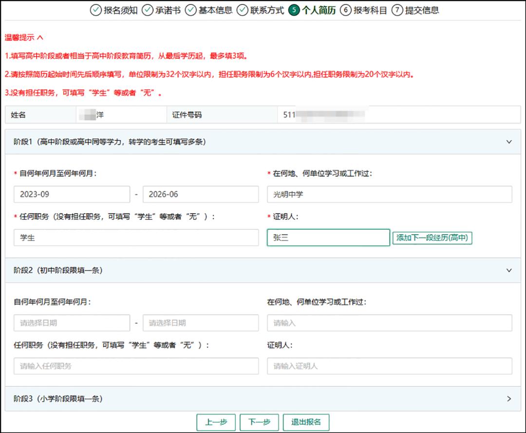 个人简历须填写至少一个阶段的简历,考生如果在高中阶段存在转学等情况,则可点击“添加下一阶段经历(高中)”增加转学阶段的简历,最多可添加2段高中简历。
