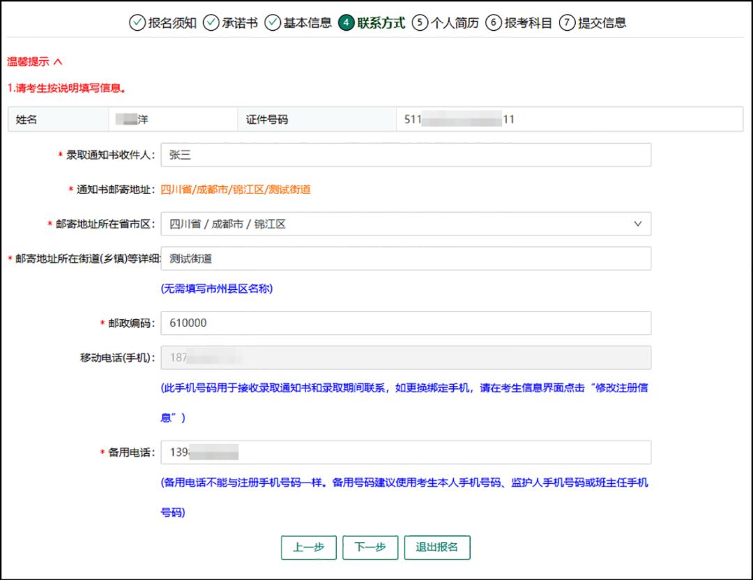 姓名、证件号、县区、报名点等信息已经在系统显示,考生按照报名表要求填写其他信息,包括民族、户籍性质、户籍地、政治面貌、毕业类别、毕业学校、是否残疾考生等。填写完成后点击下一步。
