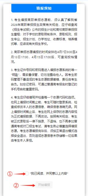 在图2中仔细阅读填报须知,勾选标记①“我已阅读,并同意以上内容”,待标记②“开始填报”按钮可用后,点击“开始填报”按钮,进入个人信息页。