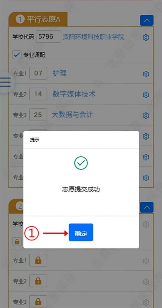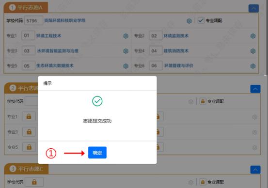 志愿保存并提交后,页面会弹出提示框,如图15所示。点击图15提示框中标记①“确定”按钮后,进入填报后注意事项页面。