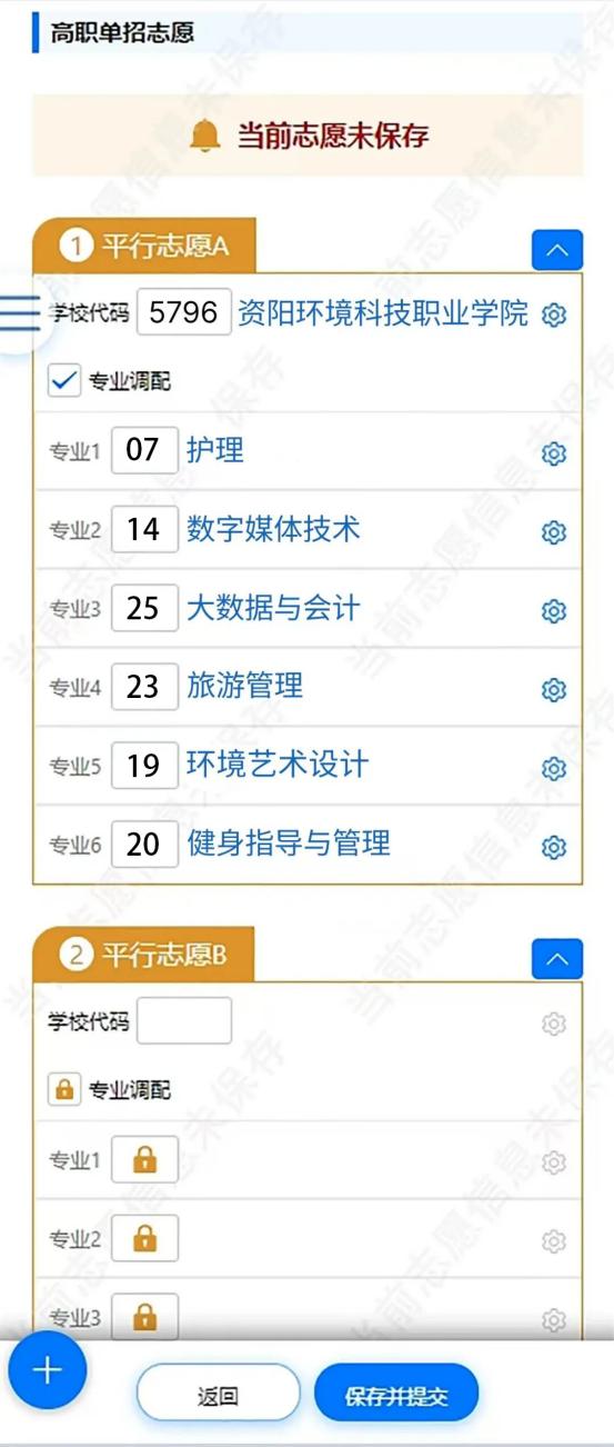根据查询到的计划信息,在图11填写志愿页面中填写志愿信息。依次填写标记①学校代码,选择是否勾选标记②专业调配(勾选表示服从专业调配,不勾选表示不服从专业调配),再依次填写标记③专业代码,其他平行志愿填写以此类推。填写完成后,点击下方标记④“保存并提交”按钮,保存并提交当前志愿。填写后准备点击“保存并提交”按钮的志愿如图12所示。