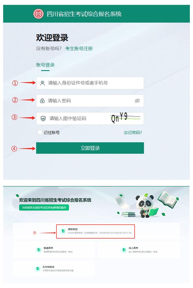 依次在图1中标记①输入身份证件号或者手机号,在标记②正确填写密码,在标记③正确输入图片中的验证码,④“登录”按钮可用后点击“立即登录”按钮,登录系统。登录成功后点击标记⑤,进入高职单招志愿填报系统。