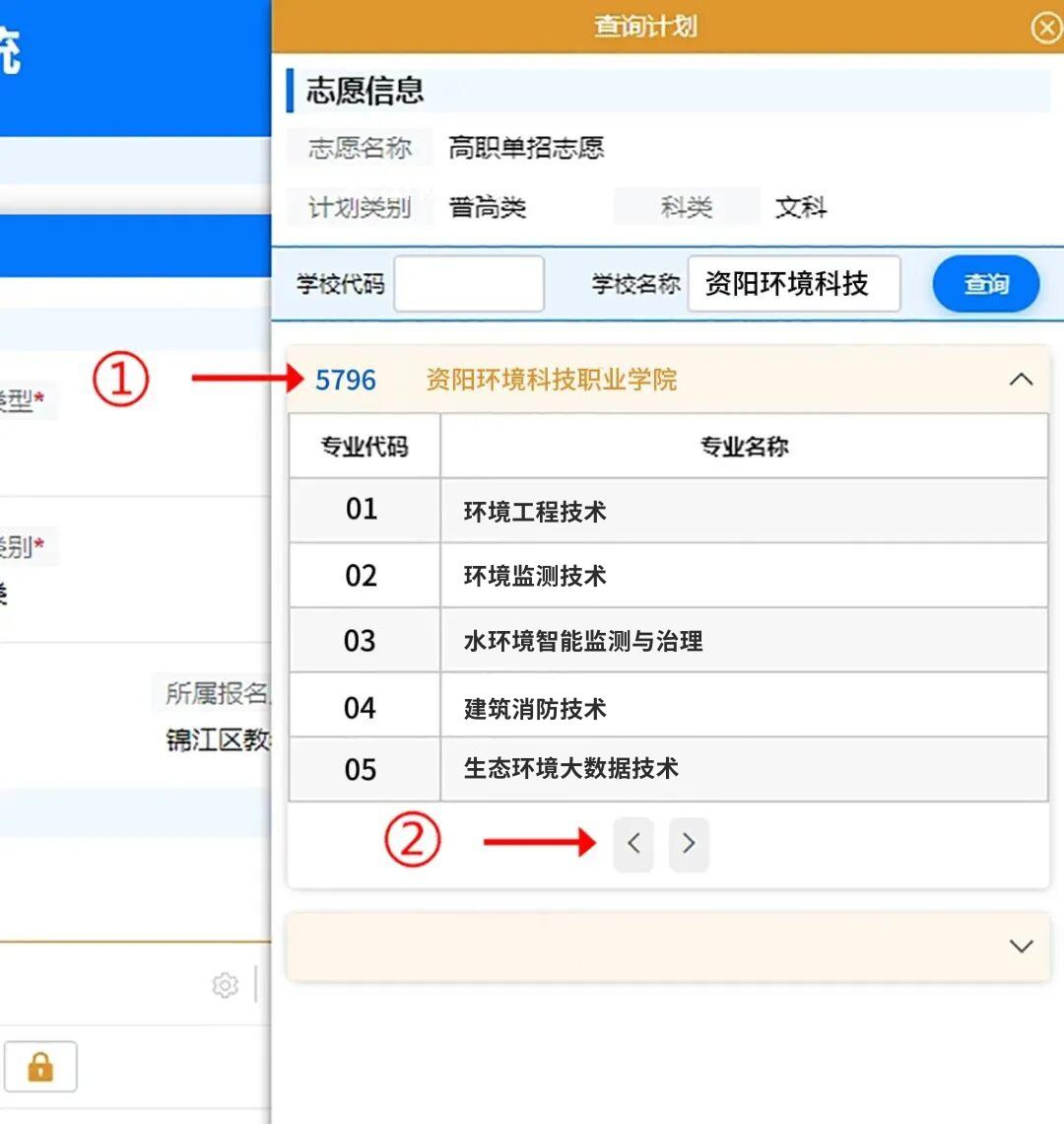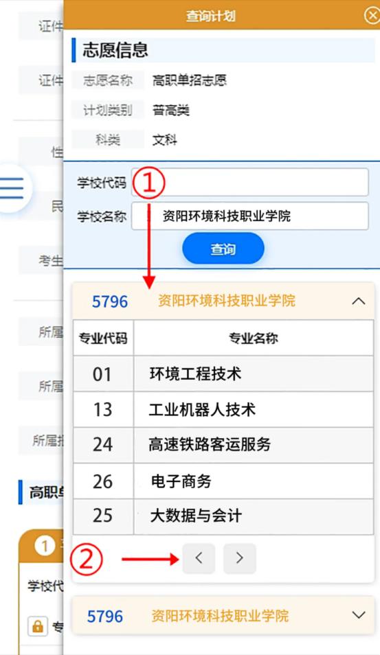 在图12中点击标记①院校标题,展开当前院校的专业代码和专业名称。点击标记②左右翻页按钮查看当前院校的所有专业代码及专业名称。