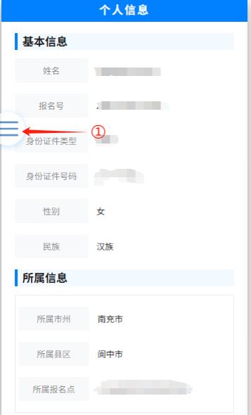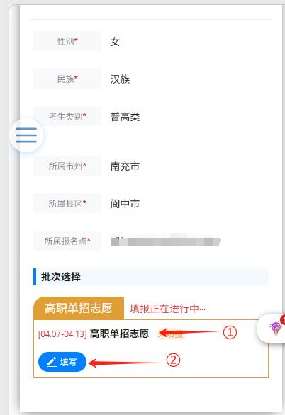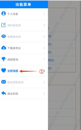 在图3中点击左上方标记①悬浮菜单图标,打开菜单。菜单展开后,点击图4中标记①“志愿填报”进入批次选择页。