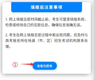 仔细阅读图14填报注意事项内容后,可点击标记①“查看志愿表”按钮进入查看志愿页面。查看志愿页面如图15所示。