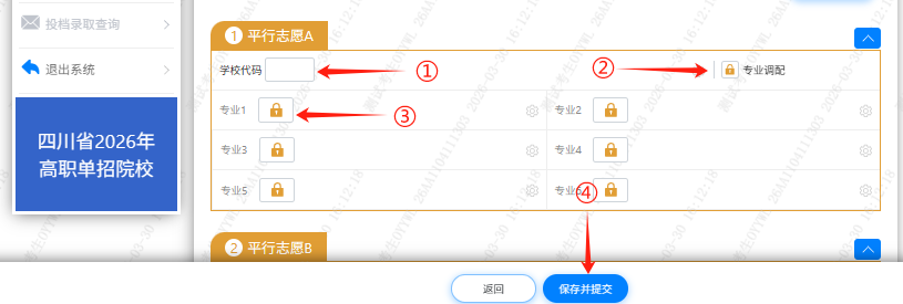 根据查询到的计划信息,在图13填写志愿页面中填写志愿信息。依次填写标记①学校代码,选择是否勾选标记②专业调配(勾选表示服从专业调配,不勾选表示不服从专业调配),再依次填写标记③专业代码,其他平行志愿填写以此类推。填写完成后,点击下方标记④“保存并提交”按钮,保存并提交当前志愿。填写后准备点击“保存并提交”按钮的志愿如图14所示。