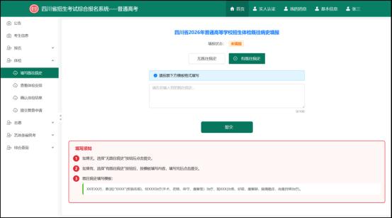 考生须在规定时间内完成既往病史填写,点击页面左边“填写既往病史”菜单,按以下情况进行填写: