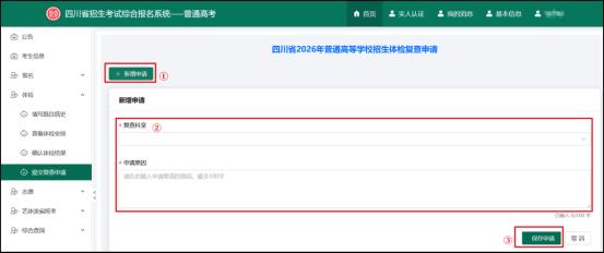 ①点击页面左边“提交复查申请”菜单,然后点击“新增申请”;